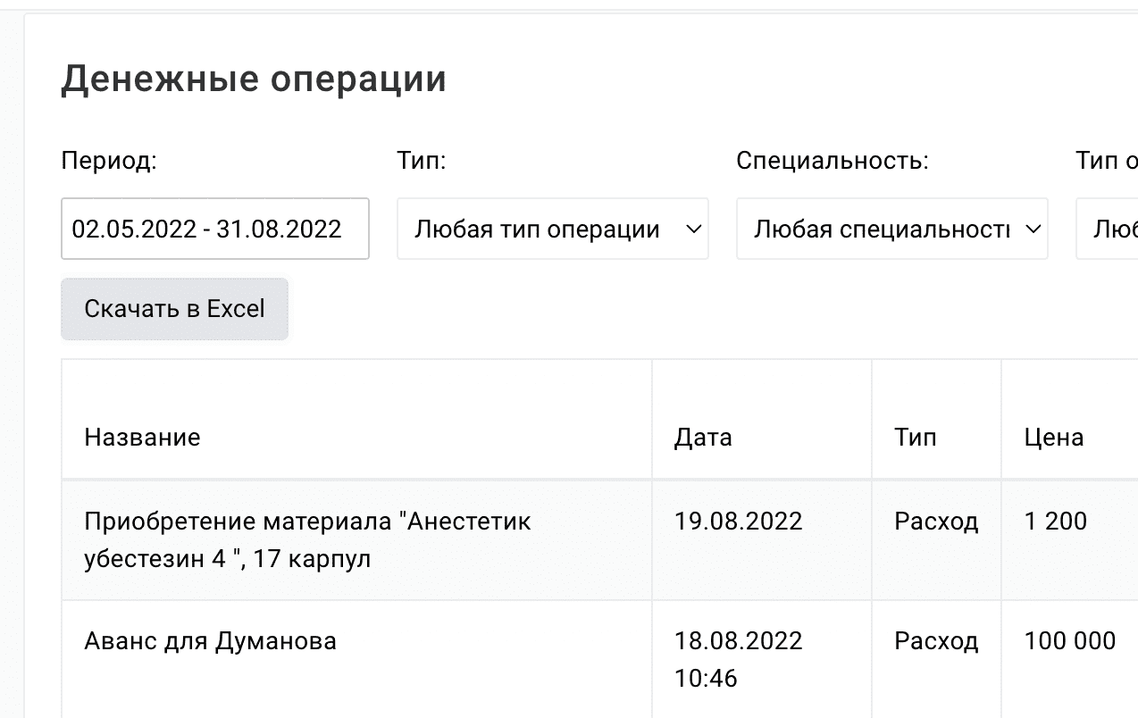 - аналитика чистой прибыли по специальностям и врачам