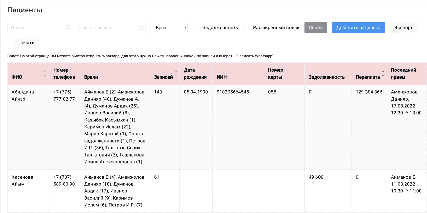 Ускорили процесс оформления пациентов, заявки сразу попадают в программу, подключили WhatsApp уведомления о приеме.