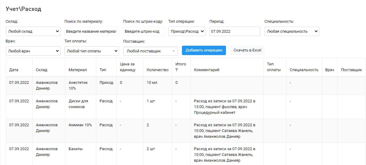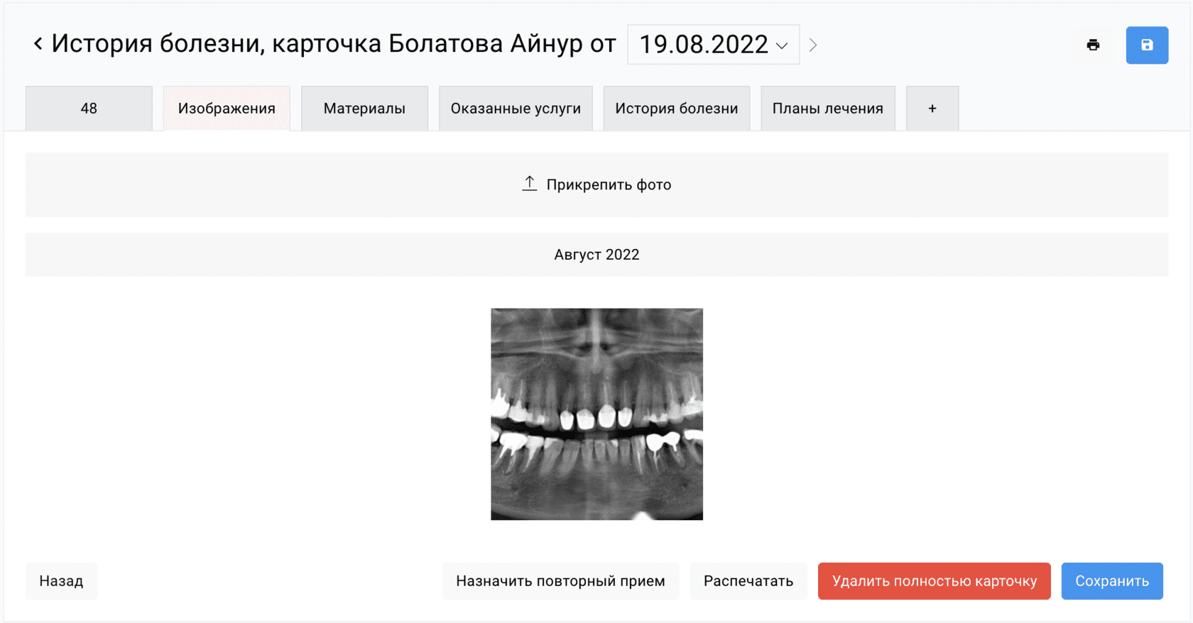 Детальный учет материалов и их остатков, а также:хранение снимков и фотографий в карте пациента