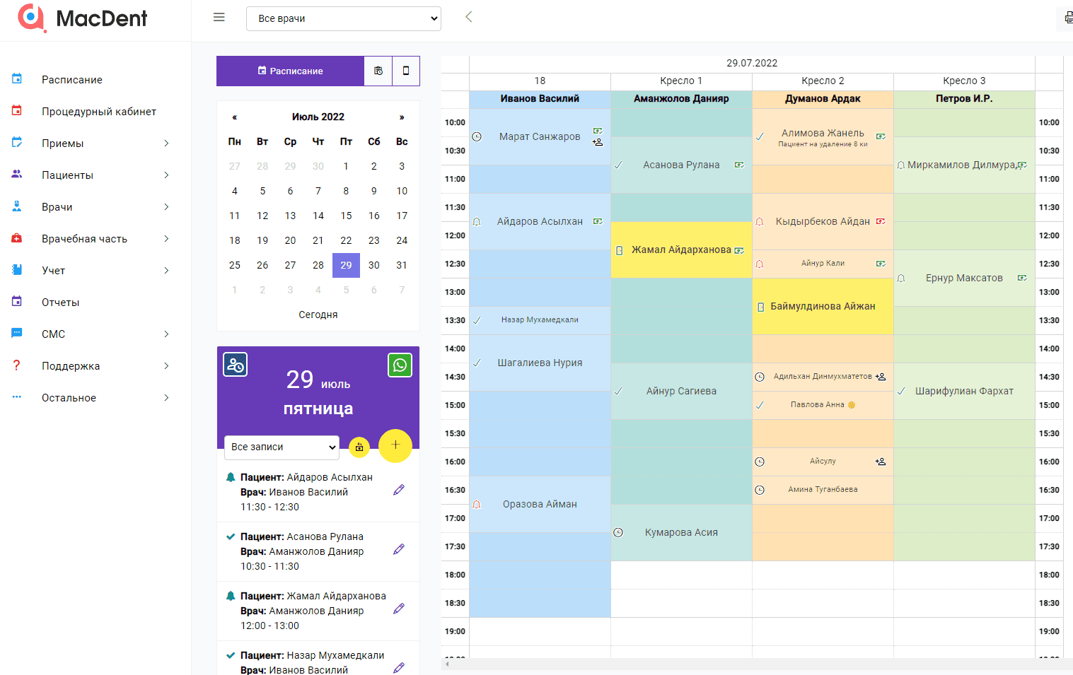 Программаның ішінде пациентке байланысты бүкіл ақпарат базада сақталынған. Пациентті дәрігердің қабылдауына жазу үшін 5-10 секунд уақыт өтеді. MacDent программасын қолдануға барлығыңызға кеңес беремін.