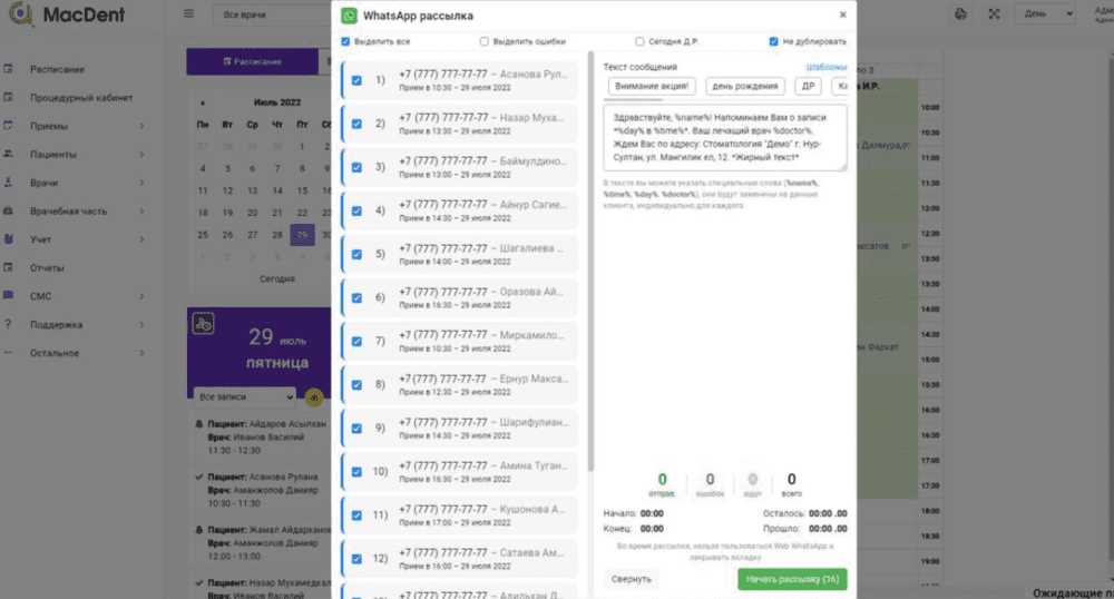 MacDent позволяет в один клик настроить автоматические уведомления по SMS и WhatsApp.